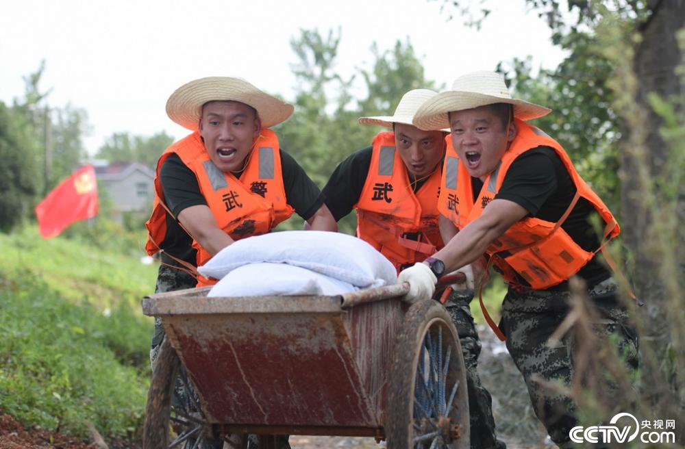 央视网消息(记者 王甲铸) 2020年7月22日,安徽铜陵,武警合肥支队官兵在铜陵市义安区西联镇老观圩西埂抢运沙袋。当日是大暑节气,地表温度高达40余度,驰援的武警安徽总队合肥支队,紧急出动50余名官兵,顶着烈日抢运沙袋1200余袋,加固堤坝500余米,抢通道路600余米,进一步巩固了堤坝安全。(武警合肥支队供图)