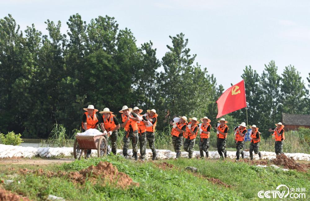 2020年7月22日,安徽铜陵,武警合肥支队官兵在铜陵市义安区西联镇老观圩西埂抢运沙袋。当日是大暑节气,地表温度高达40余度,驰援的武警安徽总队合肥支队,紧急出动50余名官兵,顶着烈日抢运沙袋1200余袋,加固堤坝500余米,抢通道路600余米,进一步巩固了堤坝安全。(武警合肥支队供图)
