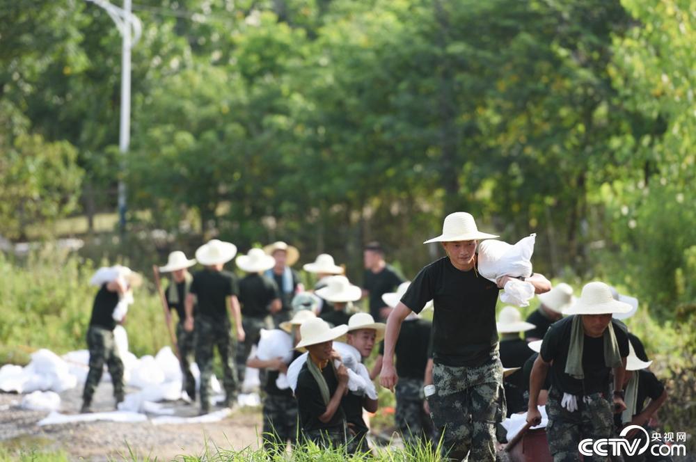 2020年7月22日,安徽铜陵,武警合肥支队官兵在铜陵市义安区西联镇老观圩西埂抢运沙袋。当日是大暑节气,地表温度高达40余度,驰援的武警安徽总队合肥支队,紧急出动50余名官兵,顶着烈日抢运沙袋1200余袋,加固堤坝500余米,抢通道路600余米,进一步巩固了堤坝安全。(武警合肥支队供图)