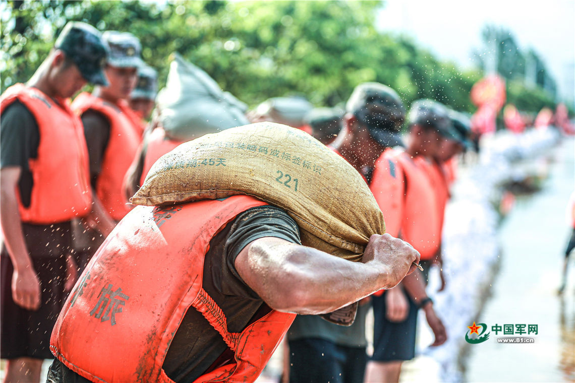 沙袋再沉重,也要咬牙坚持,因为堤坝背后,是人民的安危,子弟兵的肩膀扛得起,扛得住!