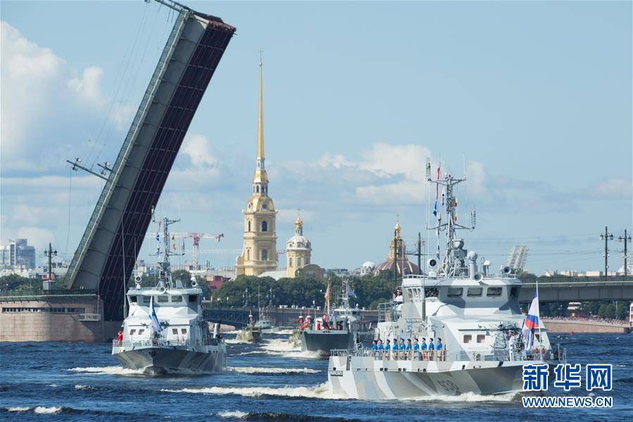 7月26日,在俄罗斯圣彼得堡,舰艇列队参加海军节庆祝活动。 当日,俄罗斯举行活动庆祝海军节。 新华社发(莫京娜摄)