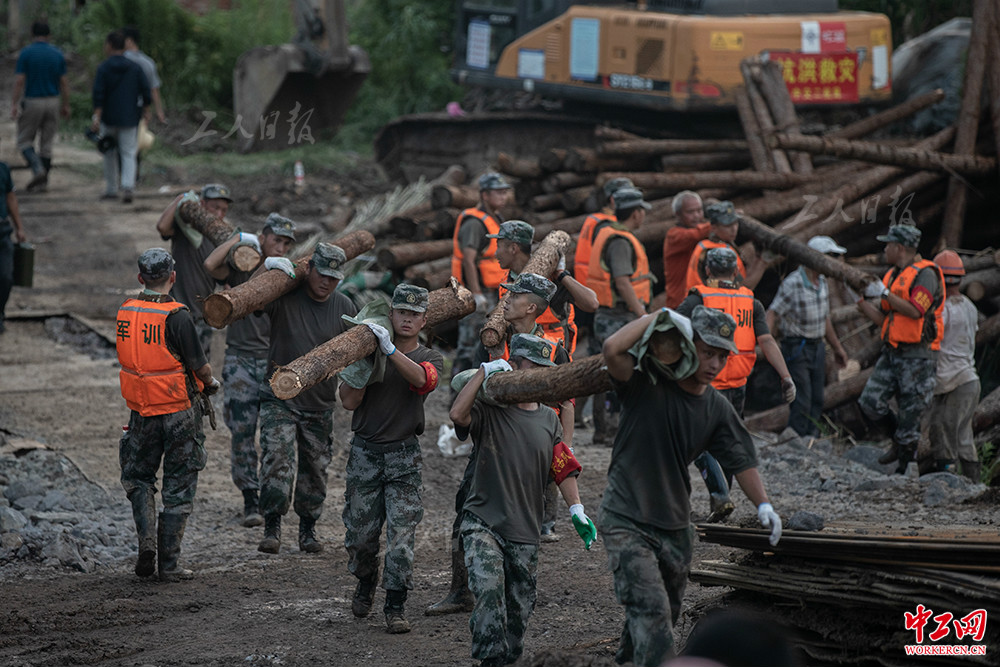 7月25日,南闸村村民将附近的水杉树砍倒,用于打桩加固内堤。解放军官兵将原木送上大堤。记者 王伟伟 摄