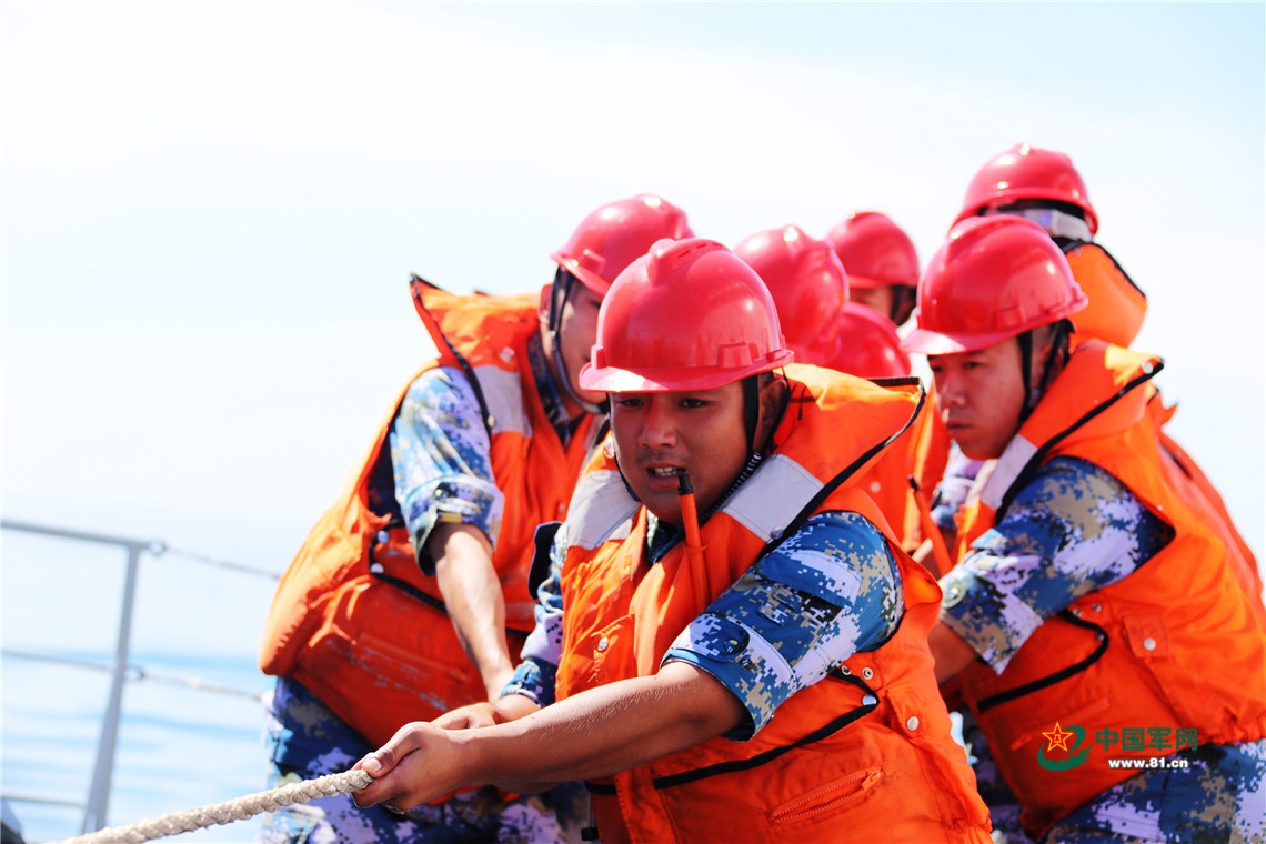 7月24日,编队开展海上补给训练,官兵在拉油管。