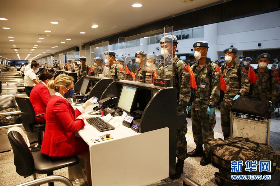 7月28日,中国第18批赴黎维和部队第一梯队官兵在黎巴嫩贝鲁特拉菲克·哈里里国际机场办理登机手续,启程回国。 新华社发(彭希摄)