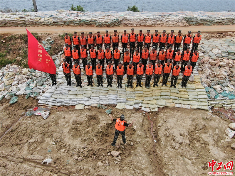 2020年7月30日,武警江西总队机动支队守坝官兵在鄱阳县鄱阳镇昌江圩江家岭段圩堤上,齐唱《强军战歌》,共庆“八一”建军节。连日来,江西长江九江段、鄱阳湖水位缓退,险情也随之减少。但守护在鄱阳县鄱阳镇昌江圩朱家桥村至江家岭村段的武警江西总队机动支队千余名官兵,却丝毫不敢放松警惕,每天派出小分队,24小时坚守在昌江圩大堤上。曹先训/人民视觉