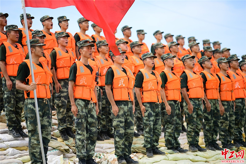 2020年7月30日,武警江西总队机动支队守坝官兵在鄱阳县鄱阳镇昌江圩江家岭段圩堤上,齐唱《强军战歌》,共庆“八一”建军节。连日来,江西长江九江段、鄱阳湖水位缓退,险情也随之减少。但守护在鄱阳县鄱阳镇昌江圩朱家桥村至江家岭村段的武警江西总队机动支队千余名官兵,却丝毫不敢放松警惕,每天派出小分队,24小时坚守在昌江圩大堤上。曹先训/人民视觉