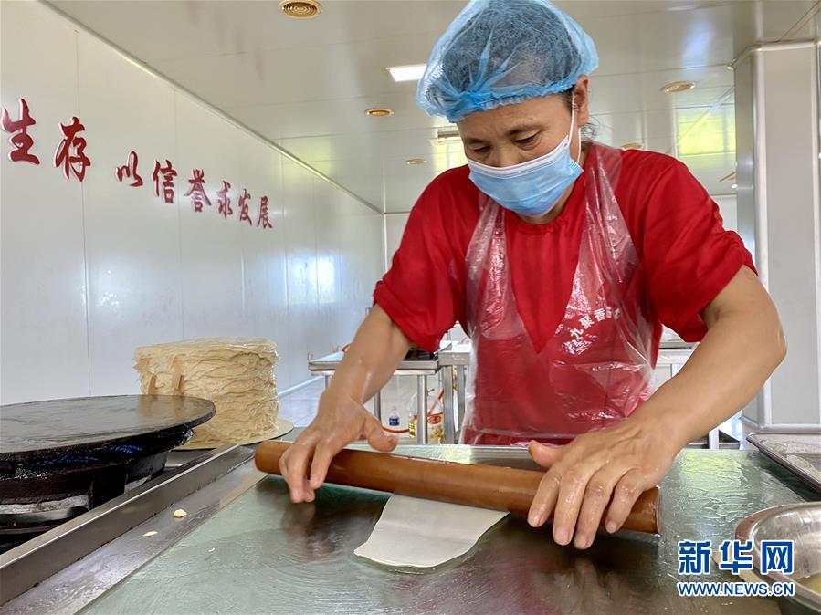 黑龙江省绥化市望奎县前惠五村村民在村内筋饼厂制作筋饼(7月16日手机拍摄)。 新华社记者 刘赫垚 摄