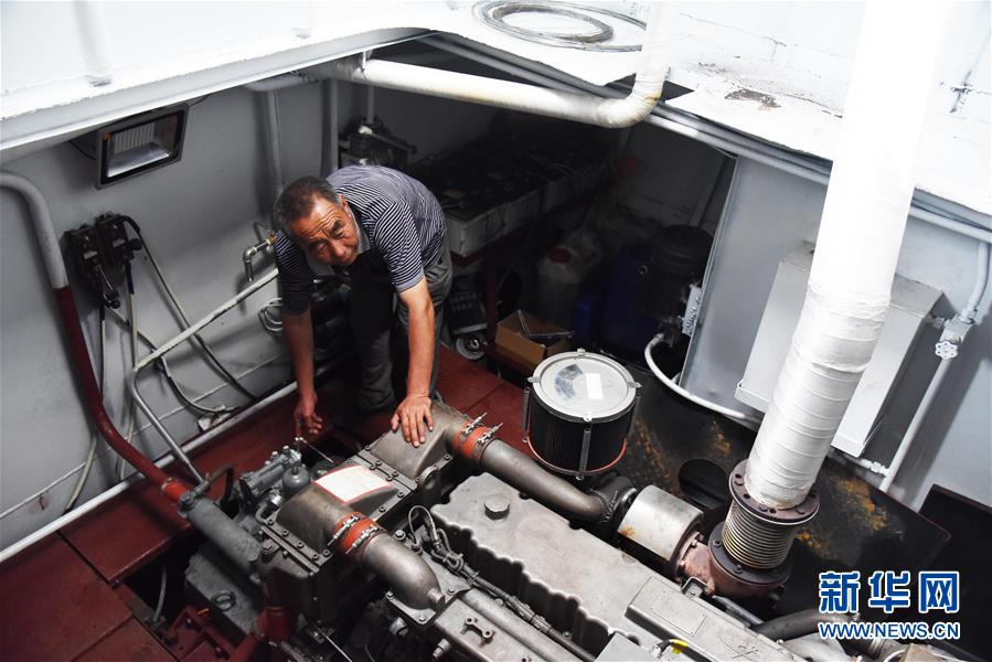 7月16日,“泰叔”钱均堂在检查“拥军船”内部的机械安全情况。新华社记者王凯摄