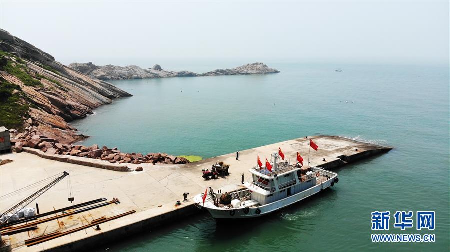7月16日,“拥军船”在苏山岛停靠(无人机照片)。新华社记者王凯摄