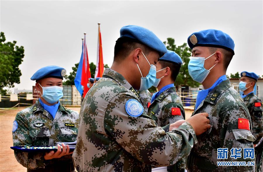 7月30日,在苏丹法希尔超级营地,维和工兵分队指挥长李萌为官兵佩戴“和平荣誉勋章”。 中国第15批赴苏丹达尔富尔维和工兵分队225名维和官兵当日被授予联合国“和平荣誉勋章”,并荣获联合国和非洲联盟驻达尔富尔联合特派团(联非达团)嘉奖。 新华社发