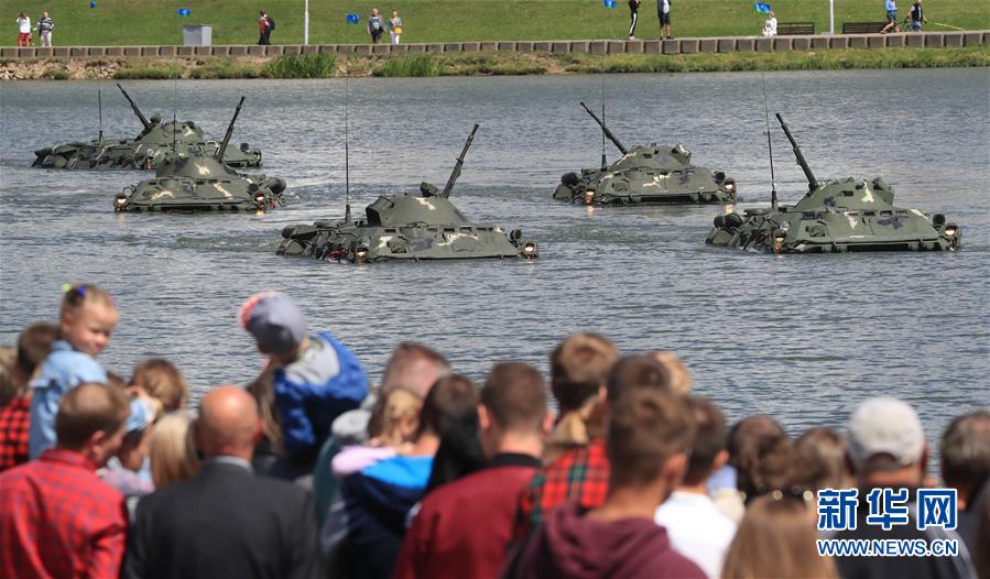 8月1日,在白俄罗斯首都明斯克,人们观看装甲车辆在水上进行的表演。 新华社发(任科夫摄)