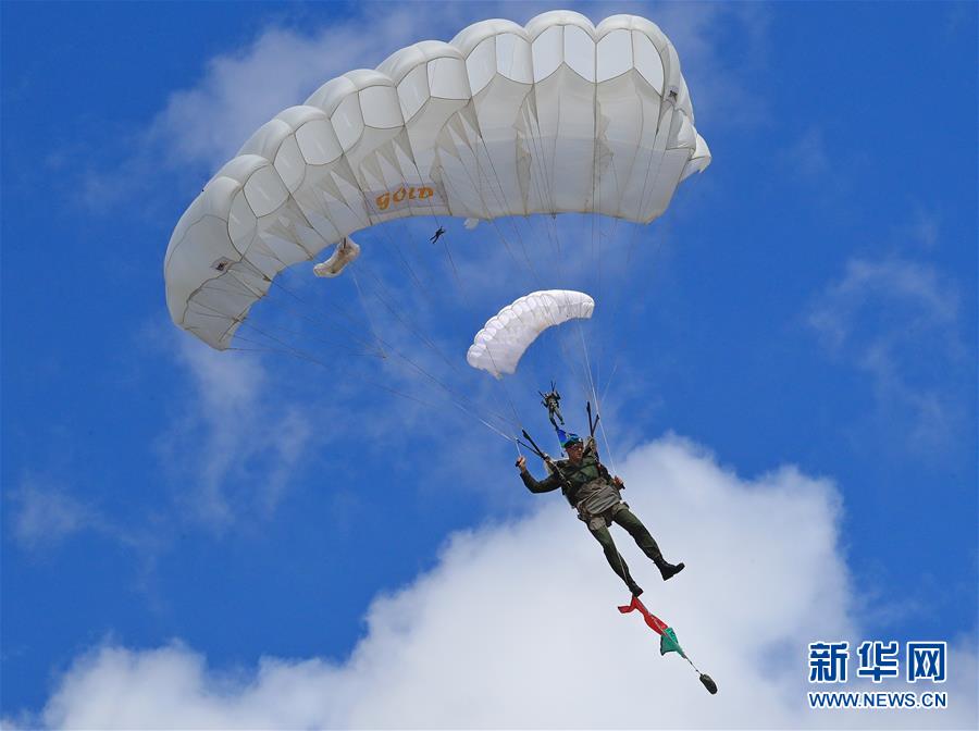8月1日,军人在白俄罗斯首都明斯克进行空降表演。 新华社发(任科夫摄)