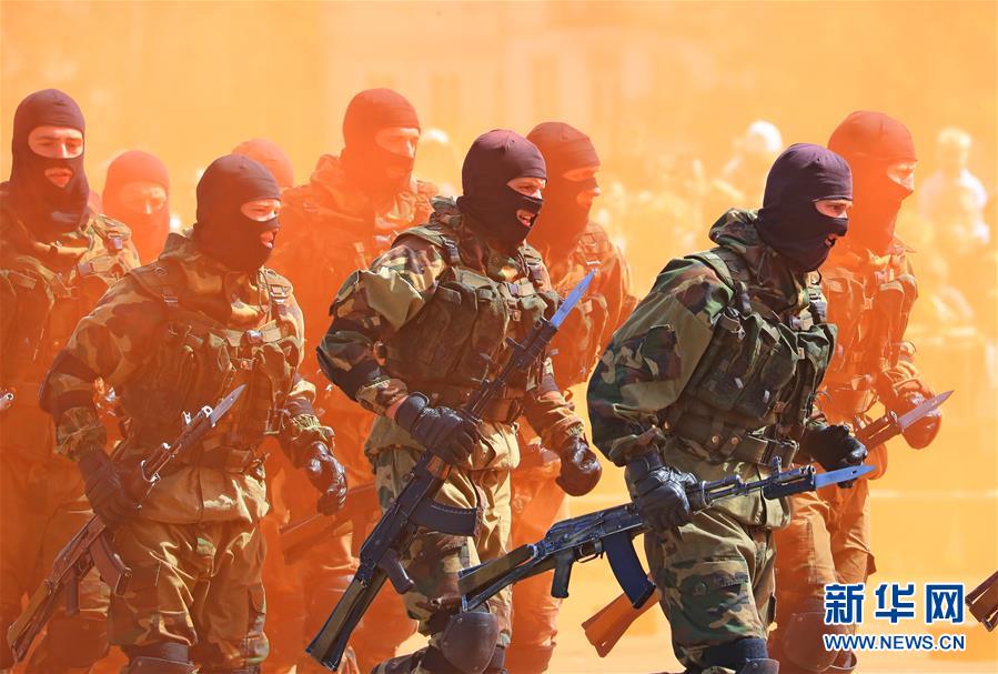 8月1日,特种作战部队军人在白俄罗斯首都明斯克进行表演。 新华社发(任科夫摄)
