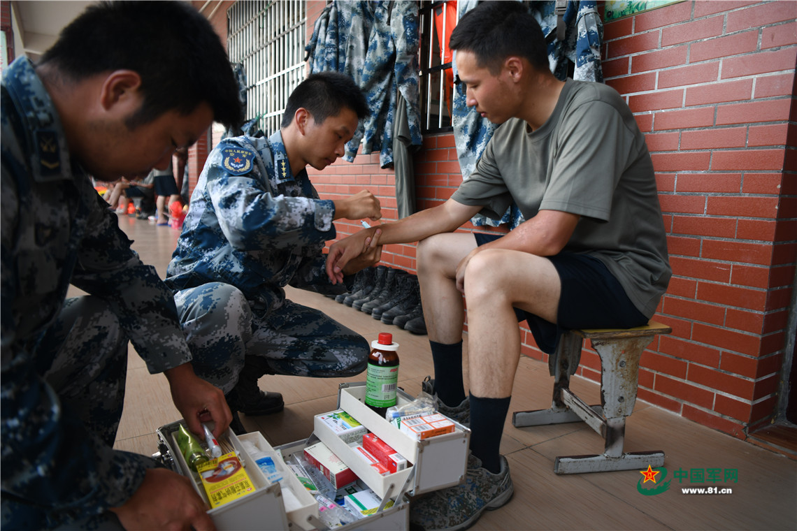 随队军医为晒伤的官兵治疗。余红春 摄