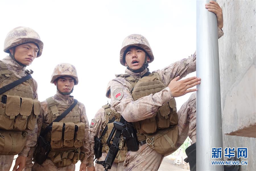 海军陆战队某旅特战连连长何龙(右一)在驻吉布提保障基地为特战队员讲解建筑物攀爬要领(8月4日摄)。新华社发(邱浩翰 摄)