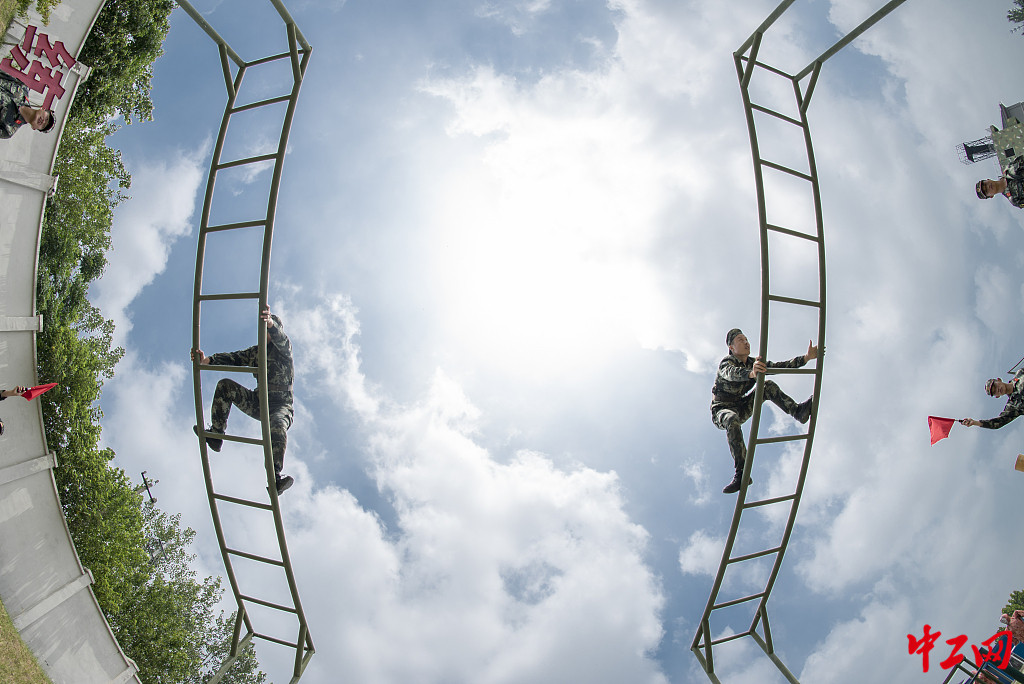 2020年08月05日,江苏宿迁,两名官兵快速通过云梯。吴佳洪/人民视觉