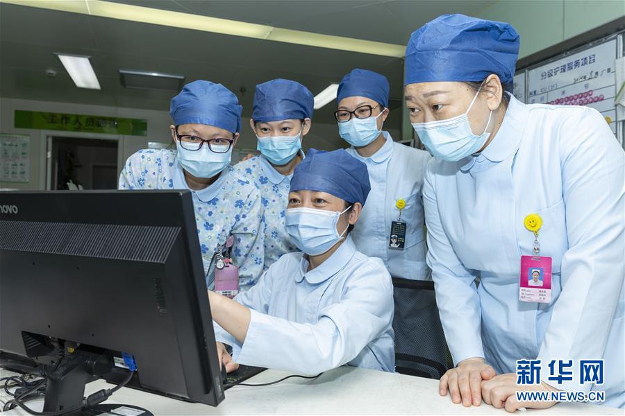 海军军医大学第二附属医院急诊、重症医学科护士长陈静(坐者)与危重症科护士交流新上线的医嘱信息系统使用情况(8月5日摄)。新华社发(汪辉 摄)