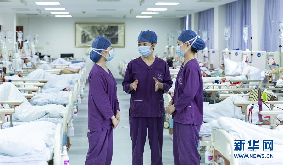海军军医大学第二附属医院急诊、重症医学科护士长陈静(中)与肾内科护士交流病人情况(8月5日摄)。新华社发(汪辉 摄)