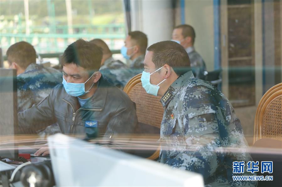 空军航空兵某旅副参谋长姚凯(左)在塔台上指挥飞行训练(2020年2月19日摄)。新华社发(李俊迪 摄)