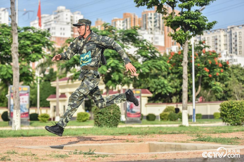 图为携枪通过100米障碍课目中,一名参赛队员跨越壕沟。(陈鑫、赵昕阳、余海洋 摄影报道)