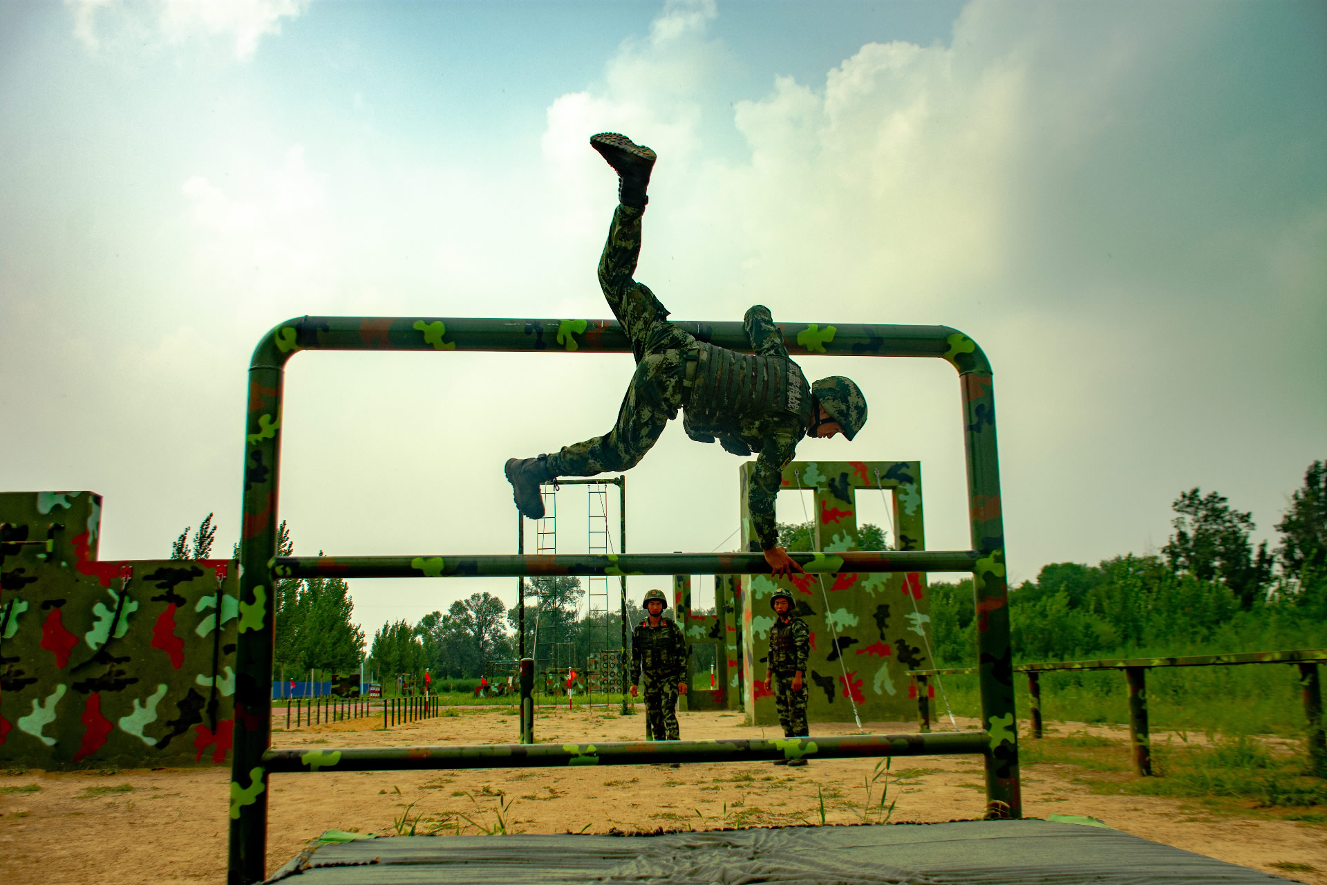 图为武警战士开展实装通过三百米障碍训练