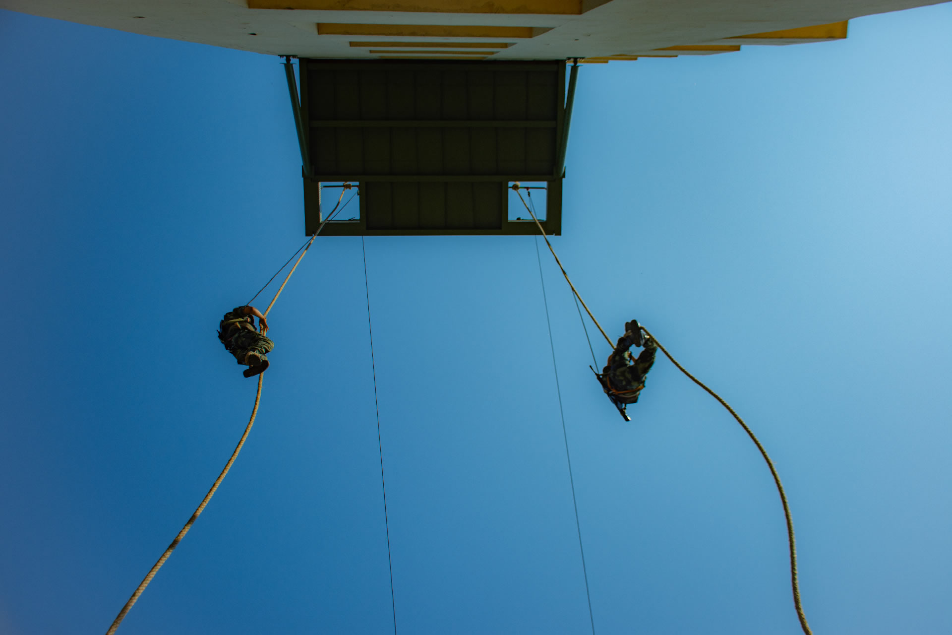 图为武警战士开展18米抓绳上训练