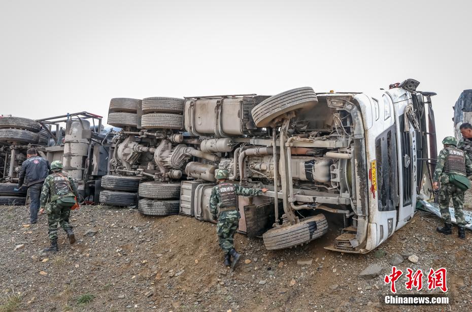 8月11日,青海省109国道可可西里无人区不冻泉路段发生车辆侧翻事故,罐体沥青外洒、油箱破损,情况危急,途径此处的武警青海总队执勤支队青藏线巡逻官兵当即迅速施救,并对受伤司机伤口进行紧急处理,同时协助过路司机对车辆损坏的油箱进行加固,确保了人民群众生命财产的安全。图为事故现场。杨浩摄