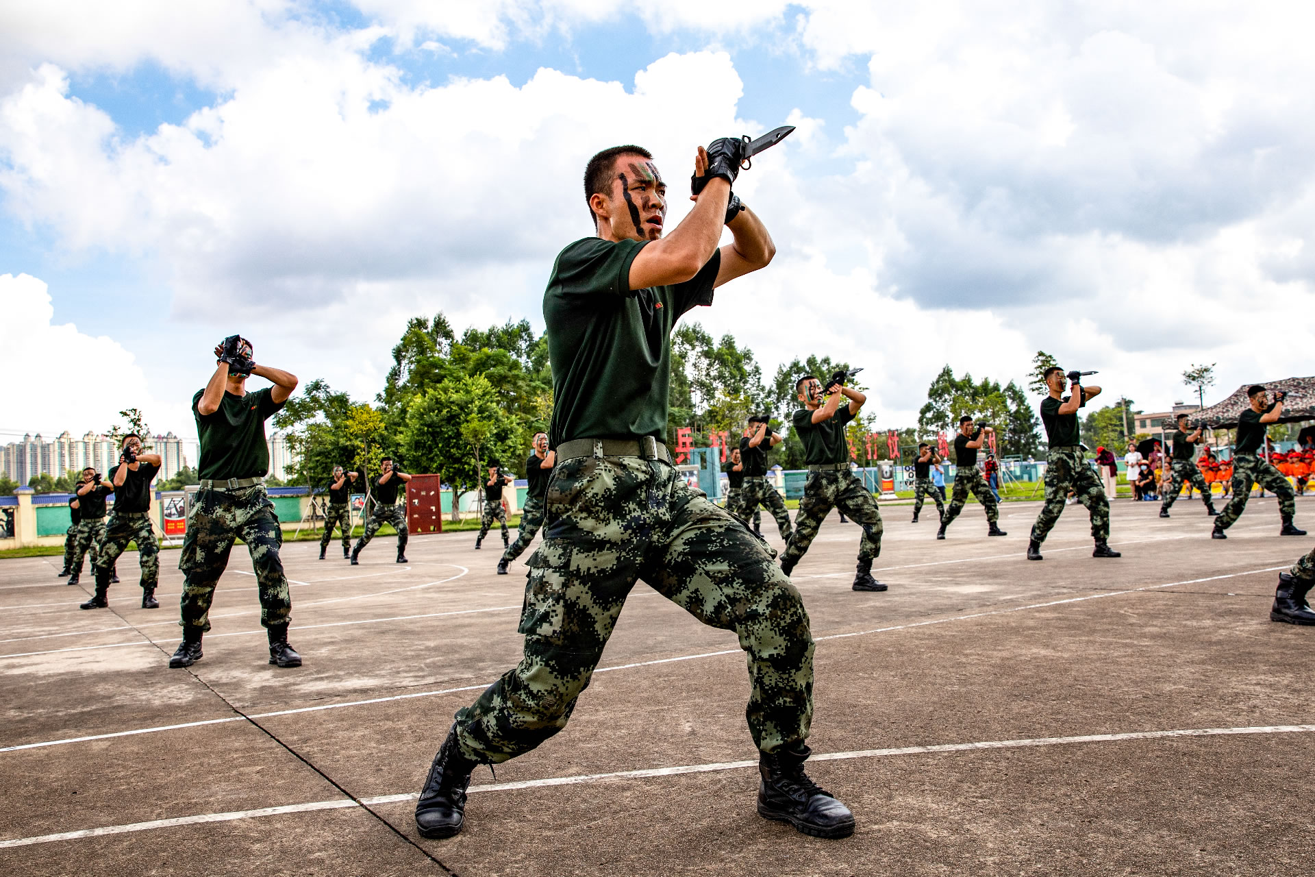 紧接着的是匕首格斗术的演示,擒敌场上,战士们杀声阵阵,挑、刺、砍、戳等动作虎虎生风,一招一式尽显革命军人刚劲本色,获得了大家的热烈掌声。