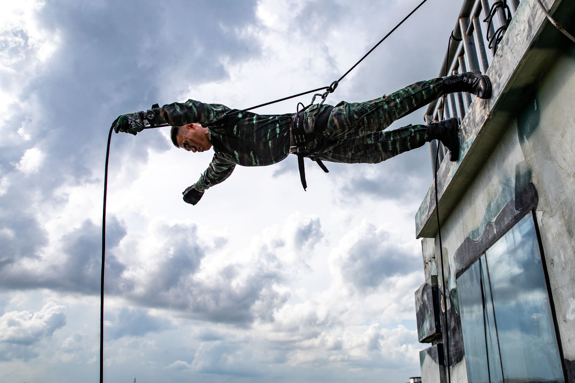 “快看!武警叔叔在楼上飞檐走壁!”在特种攀登课目中,特战队员为大家演示了飞身下、倒立下等多种攀登方式,看到这些扣人心弦的动作演示,在楼下的人都扣紧了脚拇指,不时地惊呼:“武警叔叔太厉害了”!