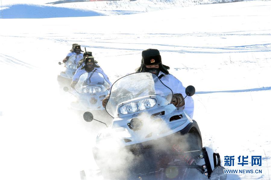 三角山边防连官兵乘坐摩托雪橇执勤(2014年1月25日摄)。新华社发(徐嘉宁 摄)