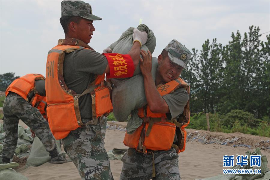 第71集团军某旅工兵连官兵在江西九江柴桑区江洲镇江新洲堤上扛运沙袋(7月18日摄)。新华社发(郭仁杰 摄)