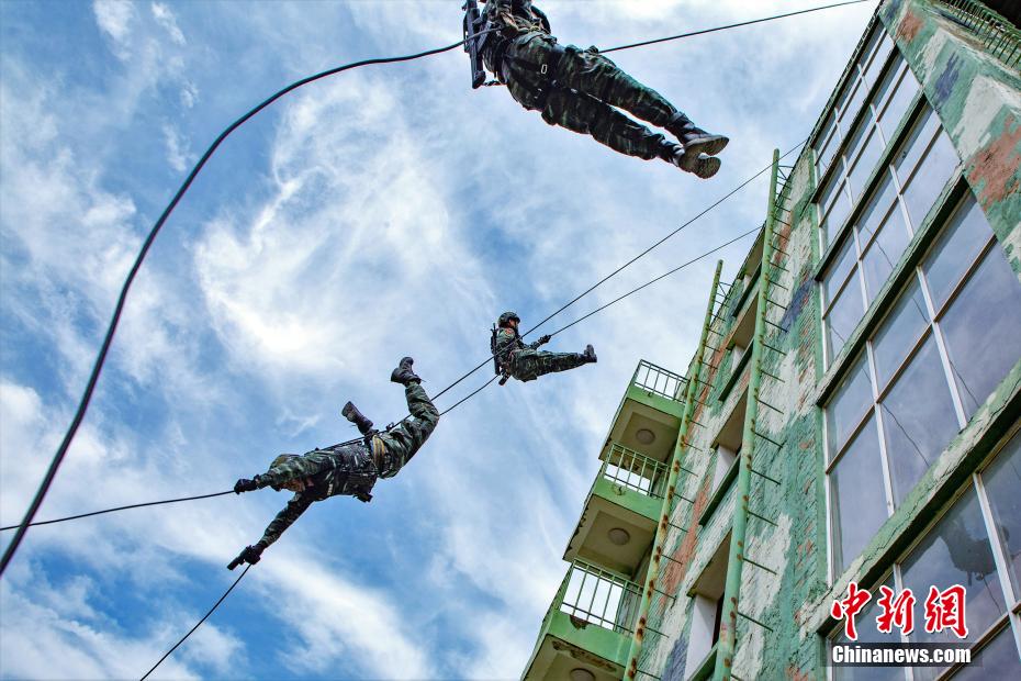 原标题: 直击武警特战队员攀登强化训练现场 仅靠一根绳飞檐走壁