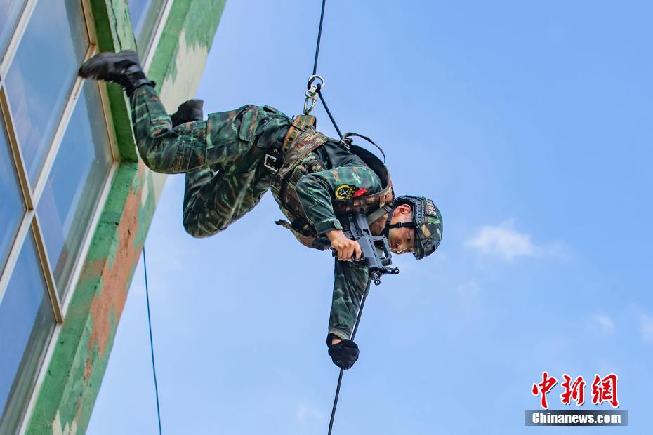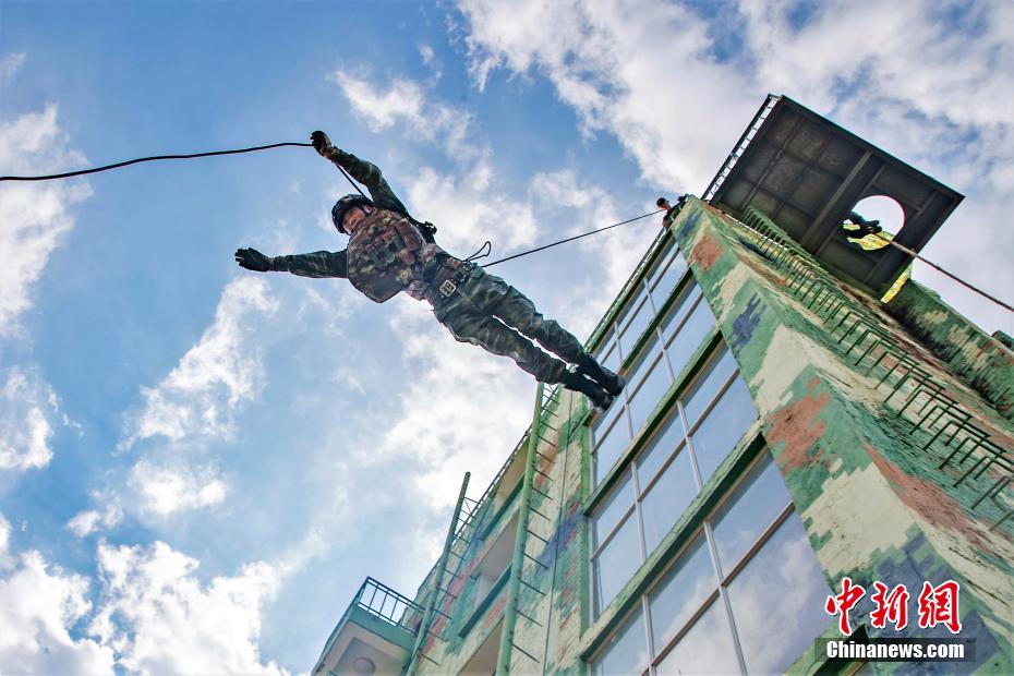 图为特战队员在进行飞身下滑训练。 余海洋 摄
