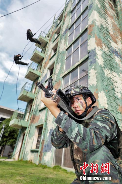 图为一名特战队员掩护队友进行下滑。 余海洋 摄