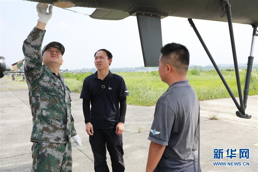 陆军装备部某航空军代局文职军代表刘文法(左一)在大修企业外场实地察看部队机组反映的问题(8月20日摄)。 新华社发(董玮 摄)