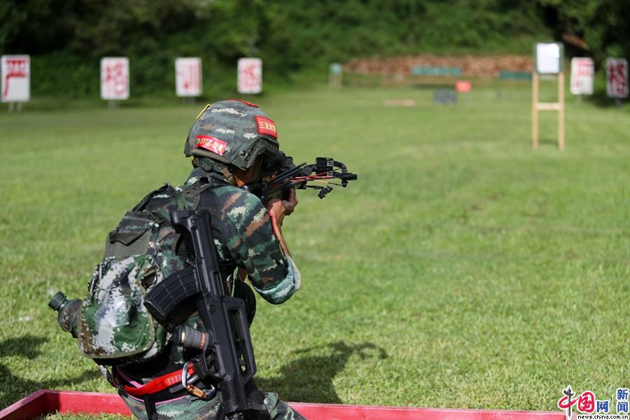 参赛队员进行个人全能比武时利用弓弩对目标进行精确打击。