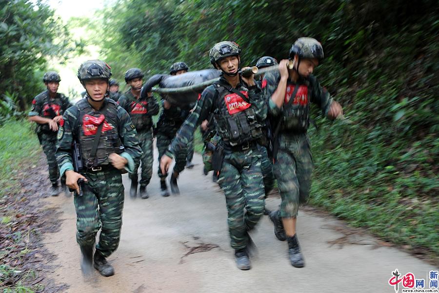 特战小队进行小队综合演练比武时利用简易担架搬运“伤员”。