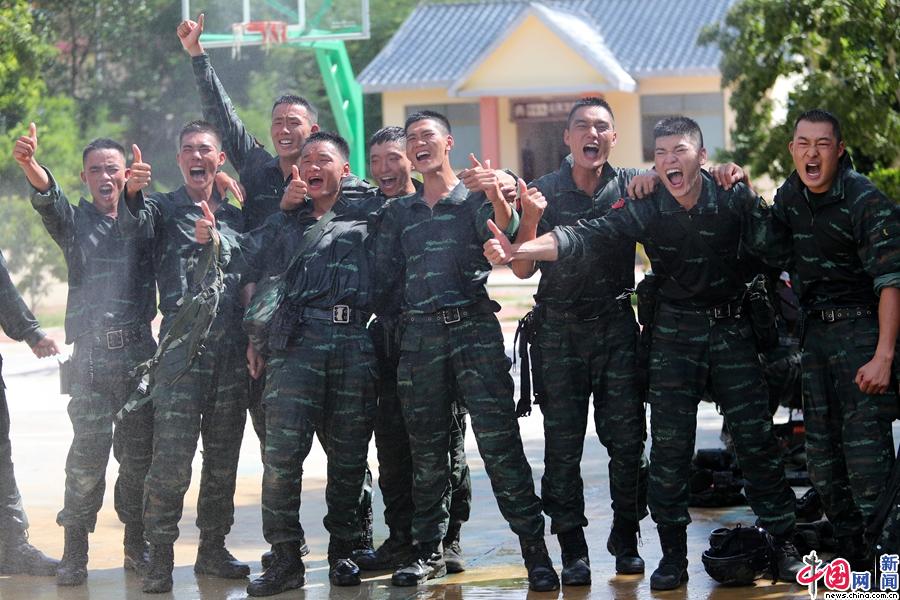 完成小队综合演练比武后,特战小队大喊战斗口号。