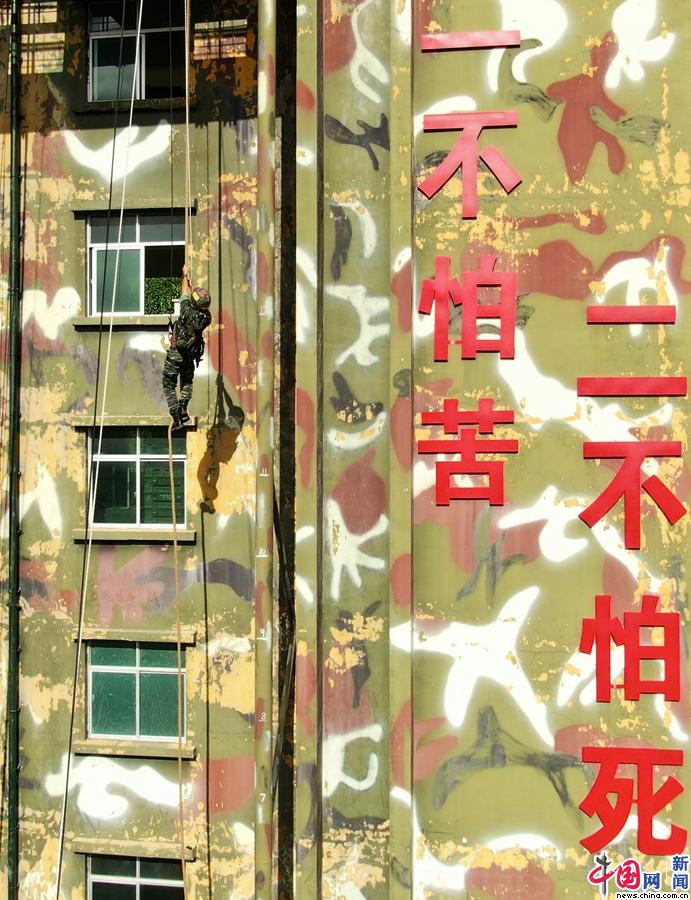参赛队员进行个人全能比武时利用大绳进行攀登。