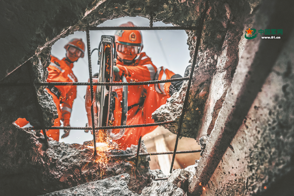 在一处有生命迹象的地点,救援官兵迅速展开搜救行动。搜索组携带搜救犬和电子搜索装备从受损建筑物边缘进入,对危险源和生命源位置进行标记;顶撑组利用扩张器和承重气垫对危险部位进行加固,防止发生二次坍塌;确认安全后,破拆组借助凿破、剪切装备在伤员受困位置打开生命出口……经过不懈努力,“受困人员”被成功救出。