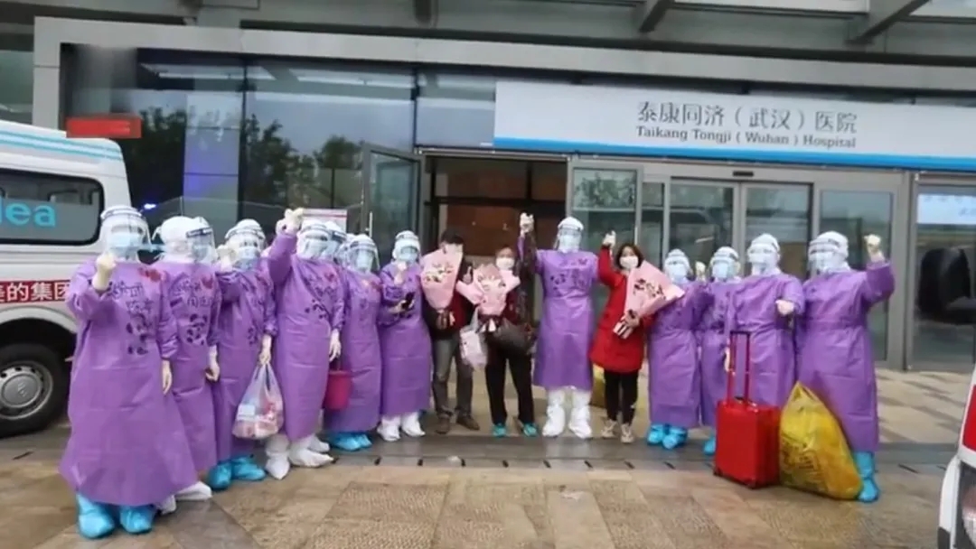 3月29日,武汉泰康同济医院感染十一科最后一批患者出院,该科室成为军队支援湖北医疗队进驻的3家医院中首个患者“清零”的科室,且治疗过程中无一例死亡。图为医护人员送别治愈患者。