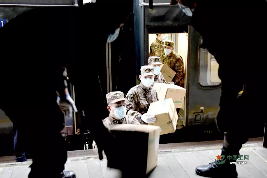 1月26日上午,全军首批从辽宁沈阳、山东菏泽紧急调拨卫生物资抵达武汉,军队前方指挥协调组协调军地双方进行物资交接。图为官兵在汉口火车站迅速搬运物资。范显海 摄