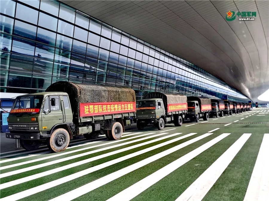 2月2日,经中央军委批准,根据中部战区命令,驻鄂部队抗击疫情运力支援队正式抽组成立,担负武汉市生活物资和医疗单位防护物资的运输保障任务。图为2月9日,该运力支援队到达武汉天河机场,执行医疗器材和防护物资运输任务。吴广 摄