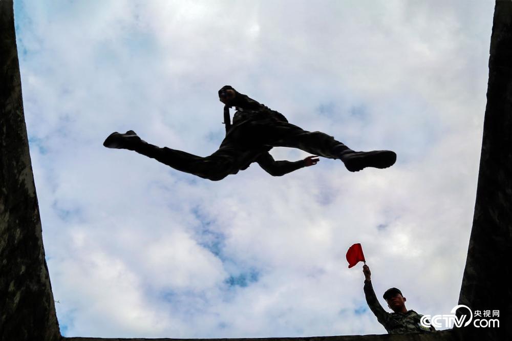 图为参赛官兵跨越壕沟障碍。(奎子清)