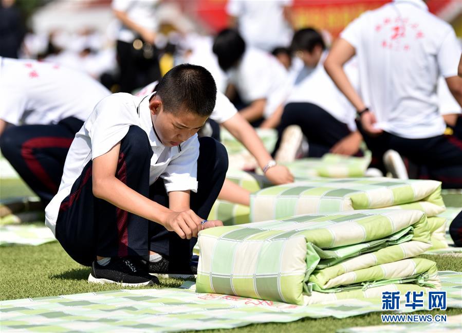 9月3日,河北省衡水市第二中学的高一新生在学校操场整理内务。 又到一年开学季,河北省衡水市第二中学组织高一新生开展为期一周的入学军训,增强学生体质,锤炼学生意志,以崭新的面貌迎接新学期。 新华社记者 朱旭东 摄
