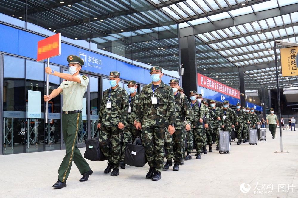 9月10日,武警第一机动总队驻天津某支队首批新兵跟随引导员走出车站。
