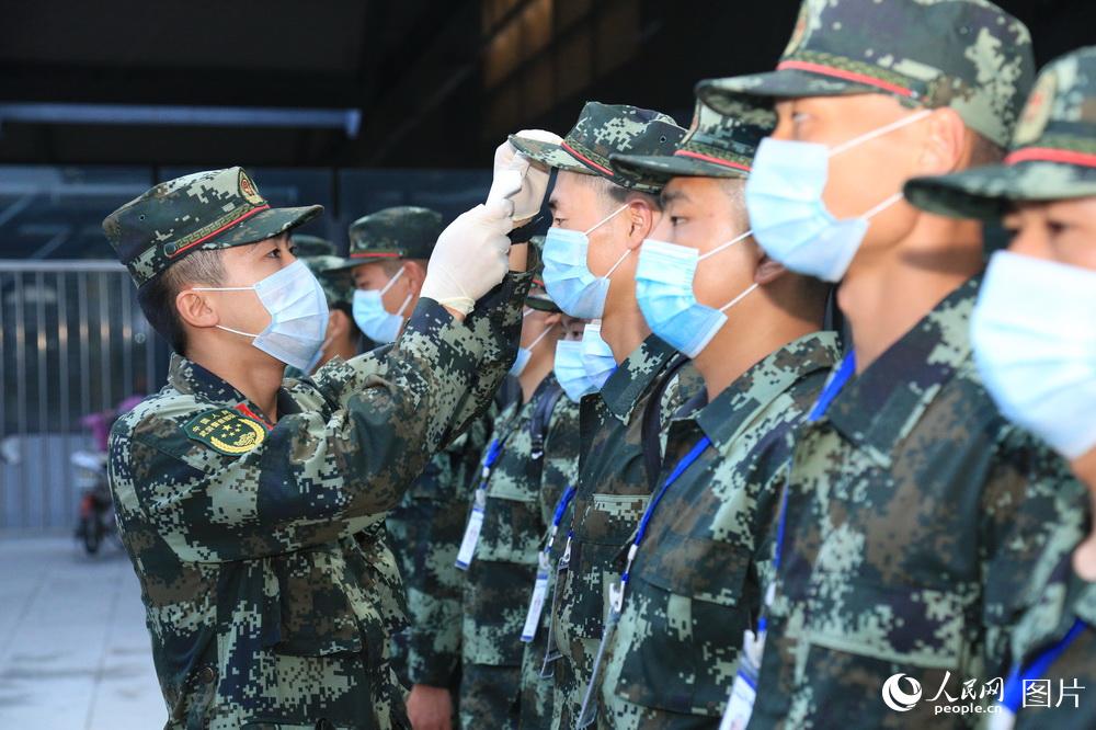 9月10日,武警第一机动总队驻天津某支队卫生员为刚下车的新兵逐一检测体温。