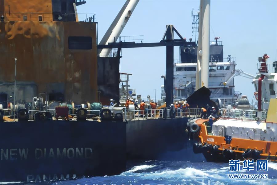 9月10日,在距斯里兰卡东部海岸约50海里处,斯里兰卡海军人员登上“新钻石”号油轮进行检查和灾难评估。 斯里兰卡东部海域“新钻石”号油轮上的大火已于9日扑灭。根据斯里兰卡海军10日发布的声明,斯里兰卡空军飞机在“新钻石”号油轮停泊的地带发现了约10至30米宽、1海里长的浮油。海军声明表示,据信这种浮油不是由船舶的原油泄漏引起,邮轮上的原油储罐未受到伤害。 新华社发(斯里兰卡海军媒体处供图)