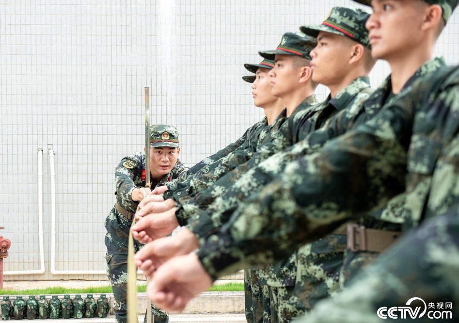 2020年9月14日,一名新训班长正在统一新兵摆臂高度。