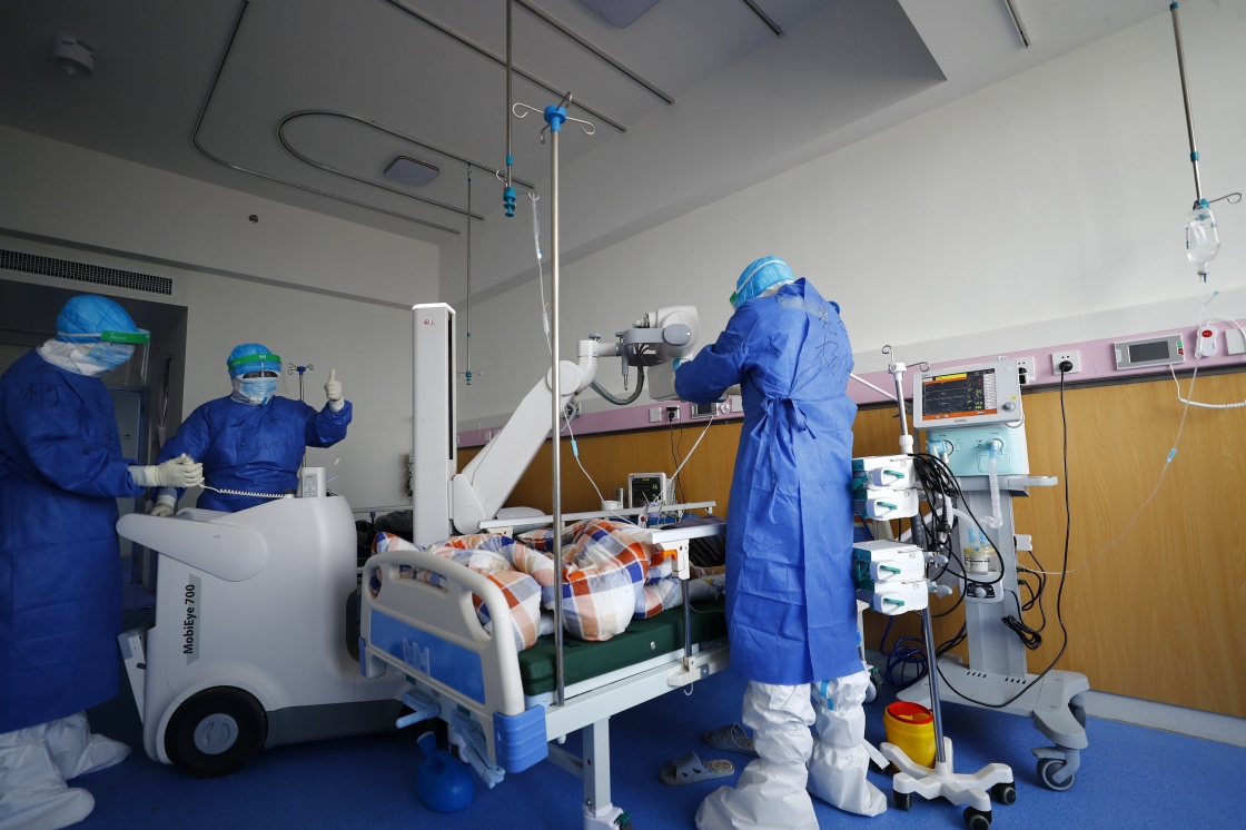在湖北省妇幼保健院光谷院区感染二科重症病房内,医护人员为重症患者做床旁胸片检查(3月10日摄)。